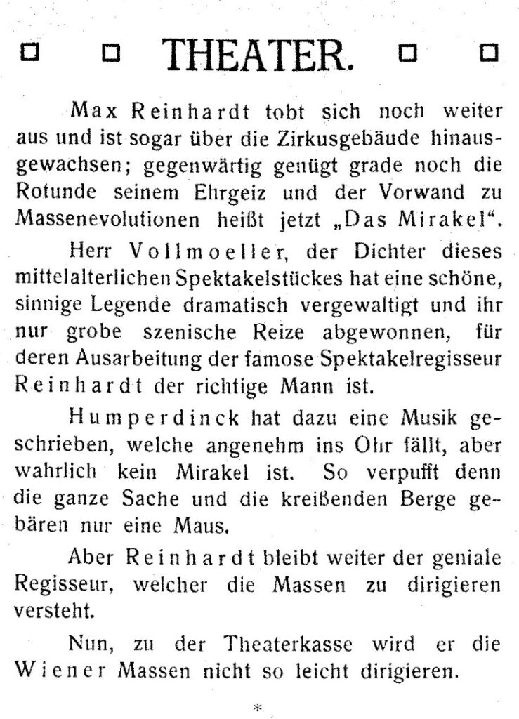 Reinhardt … ließ sich ganz von dem neuen Geist des Berlinertums fortreißen, der unter­ dessen das ganze Leben Deutschlands ergriffen hatte, unter seinen Händen geriet auch die Kunst in den Massenbetrieb des Warenhauses. Wie in den großen Restaurants Deutschlands, sollten nun die Menschen auch gemeinsam mit Durchschnitts­kunst abgespeist werden. Tausend Statisten oder tausend Kellner, fünftausend Zuschauer oder fünftausend Hungrige, Austern oder Sophokles, Weißbier oder Vollmoeller, die Unterschiede ver­schwinden. Theater und Zirkus, beide hatten bisher ihre Be­rechtigung, ihr Publikum. Warum man aber im Theater Zirkus­kunststücke machen, warum man im Zirkus Theater spielen muß.
